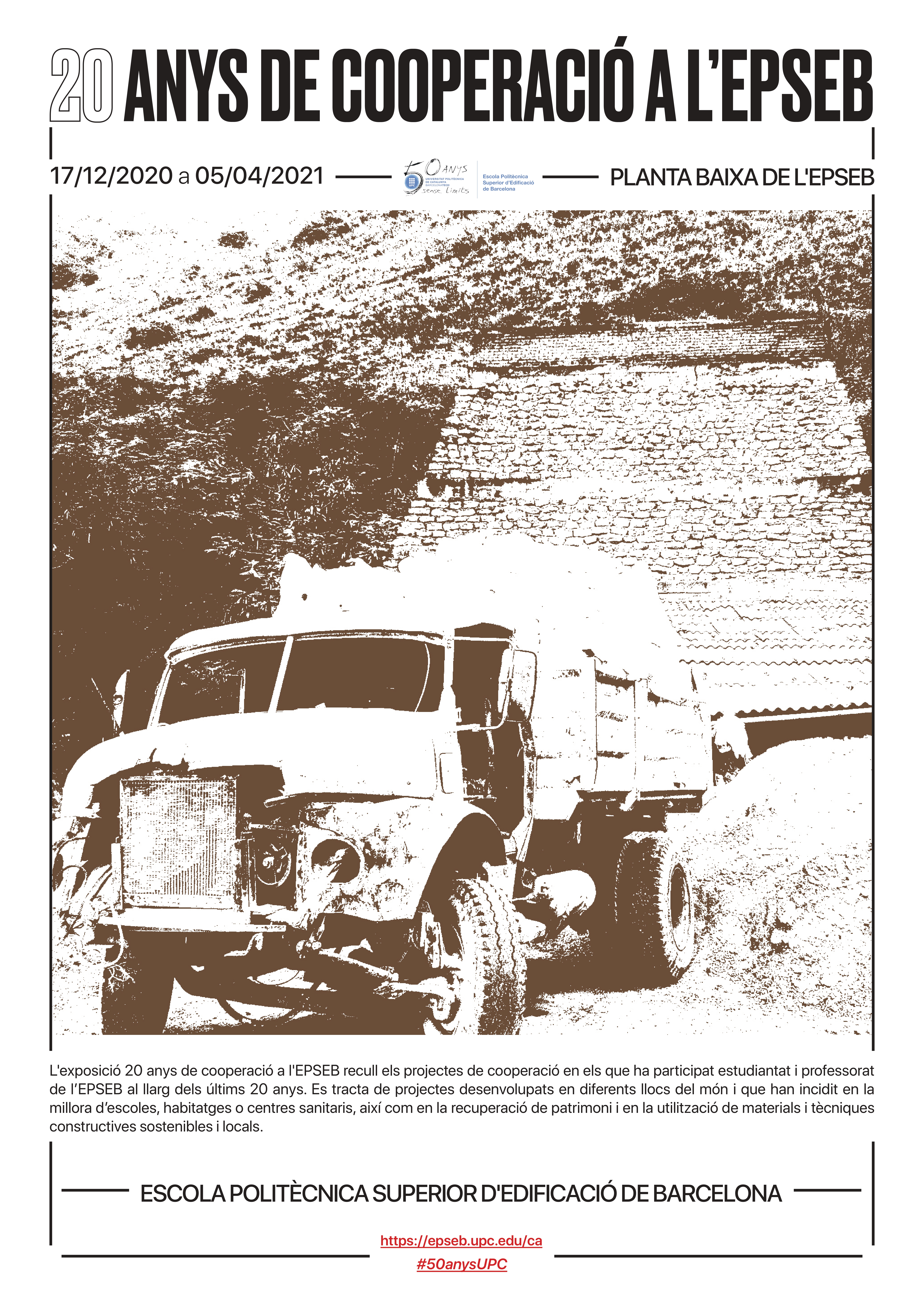 L'exposició 20 anys de cooperació a l'EPSEB recull els projectes de cooperació en els que ha participat estudiantat i professorat de l'EPSEB al llarg dels últims 20 anys. Es tracta d'iniciatives desenvolupades en diferents llocs del món i que han incidit en la millora d'escoles, habitatges o centres sanitaris, així com en la recuperació de patrimoni i en la utilització de materials i tècniques constructives sostenibles i locals.