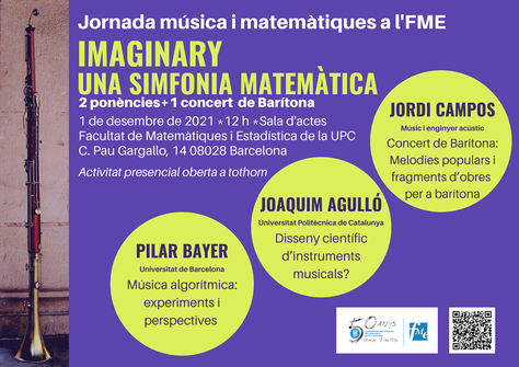 La Facultat de Matemàtiques i Estadística (FME) celebra la jornada "Imaginary, una simfonia matemàtica": música i matemàtiques a l'FME, que tindrà lloc l'1 de desembre, a les 12 h, a la sala d'actes de la Facultat. La jornada se centrarà en la importància de la barítona, un instrument de vent, amb l'objectiu de parlar del binomi entre les matemàtiques i la música. L'activitat s'organitza en el marc de l'exposició "Imaginary, una simfonia matemàtica" que es pot visitar al vestíbul de l'FME fins al 17 de desembre.